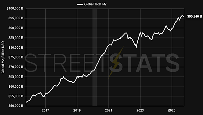 Op de voor ons belangrijkste grafiek zien we dat de wereldwijde hoeveelheid papiergeld in omloop sinds vorig jaar in een stevig stijgende trend zit.