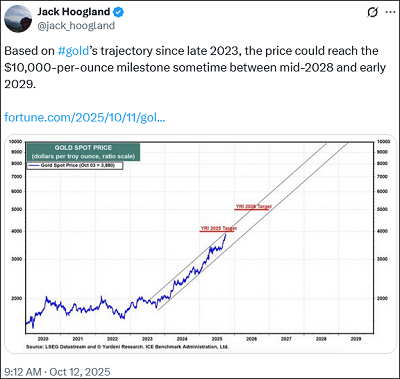 Kijken we naar goud, dan zien we hieronder dat het op weg is om eind 2028 een prijs van $10.000 te bereiken.
