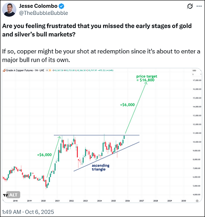 In de tweet hieronder laat Jesse Colombo zien dat de prijs van koper nu aan het uitbreken is.