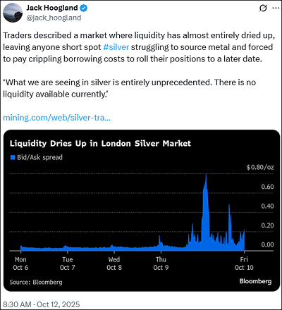 Traders met shortposities in zilver moeten fysiek zilver leveren, terwijl er niet genoeg leverbaar is.