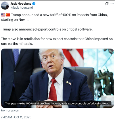 Vrijdag gingen de beursindices plotseling hard onderuit nadat Trump nieuwe 100% handelstarieven tegen China aankondigde.